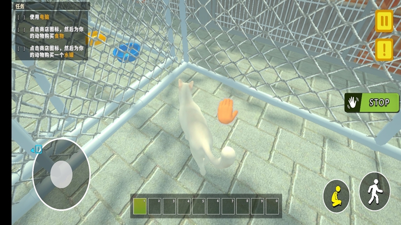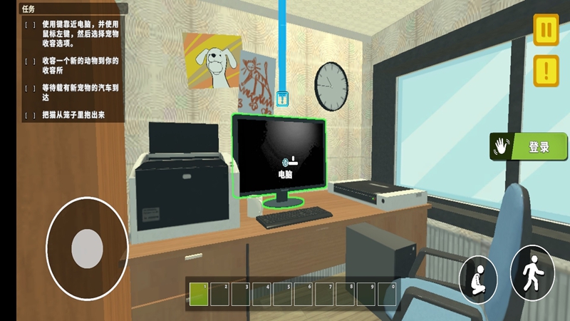 2、操控角色逛收容所,点击动物互动,执行医治清洗嬉戏等操作。