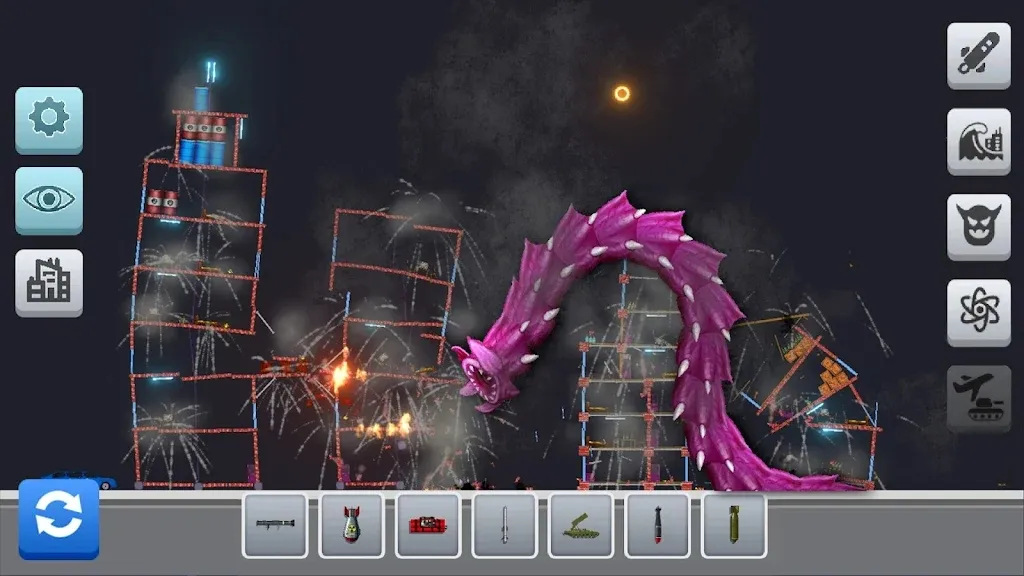 1、游乐场破坏模拟器设定在一个布娃娃物理游乐场,我们可以在其中用核弹、导弹、黑洞、激光、闪电粉碎城市,或者可能召唤怪物恢复。