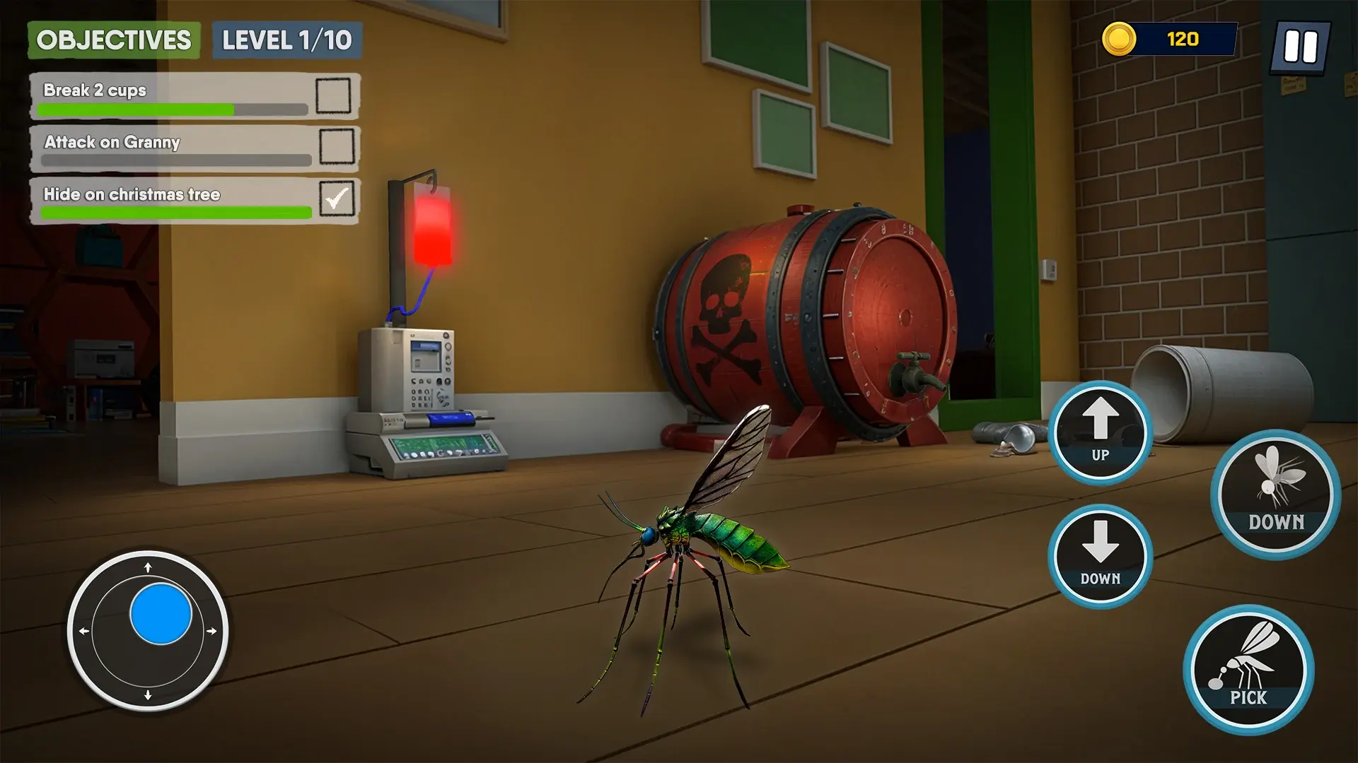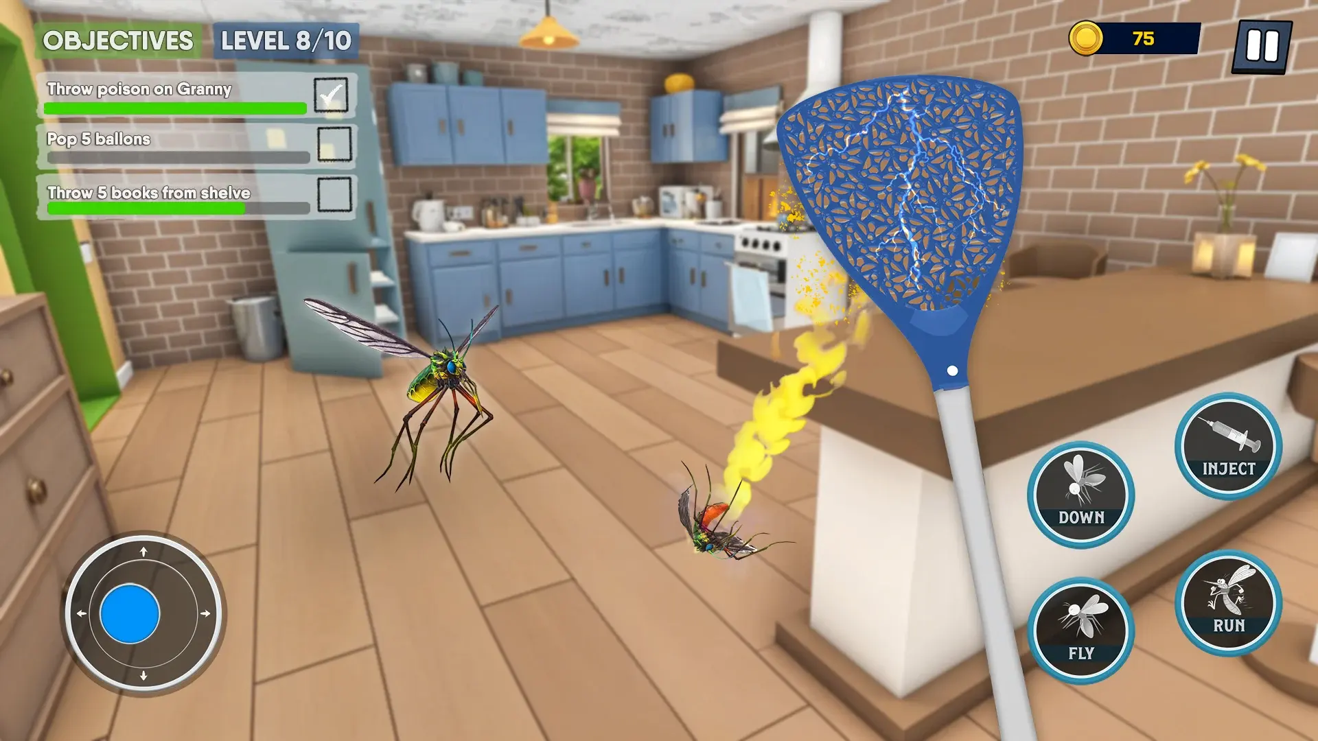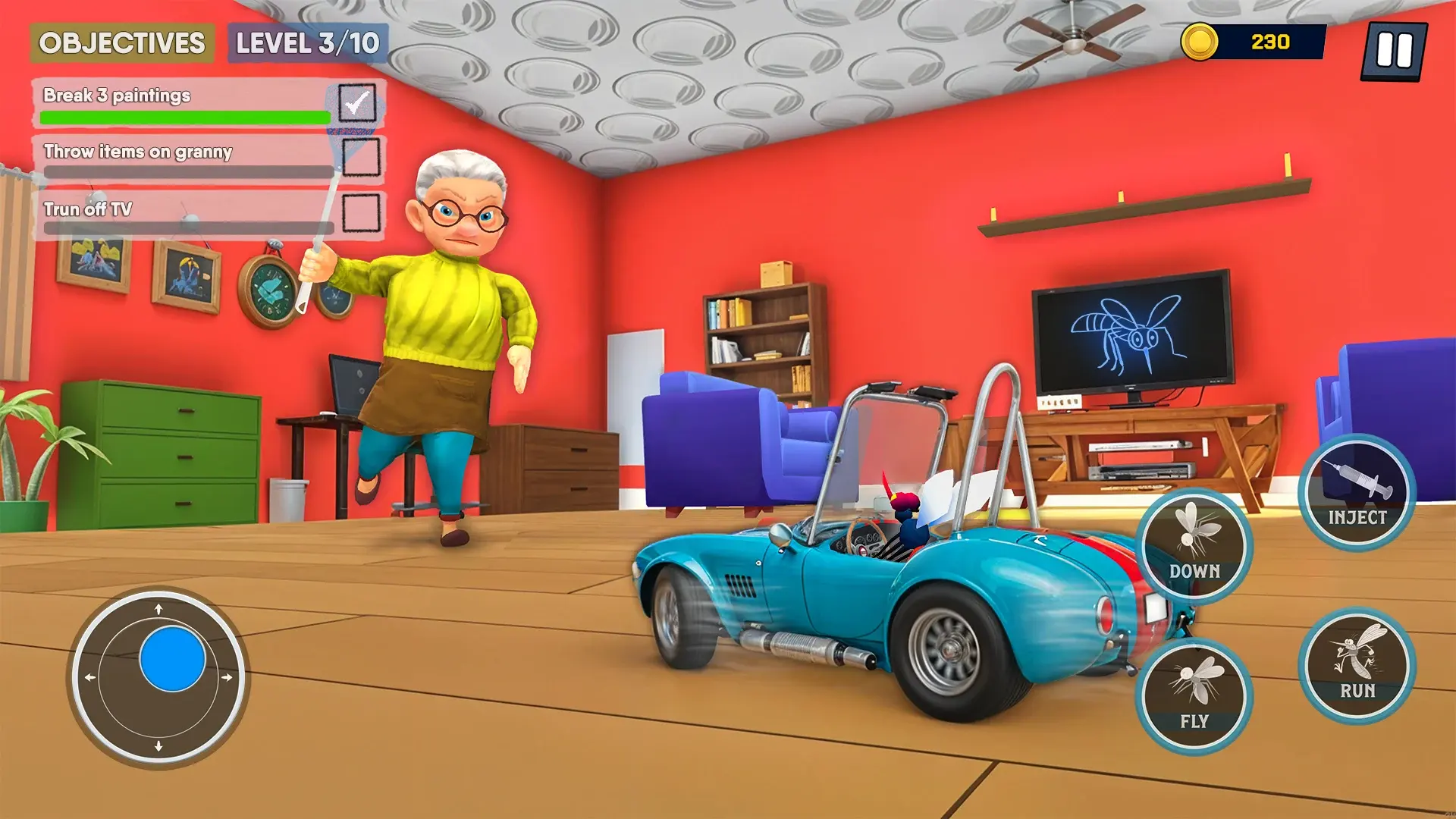 【蚊子大战老奶奶安卓版】是一款充满趣味性和娱乐性的3D昆虫模拟手机游戏,我们在游戏中将化身为讨人厌的蚊子,围绕在人类老奶奶的周围、房间里,和她展开一场滑稽的对决。我们在游戏中的任务主要是叮咬人类、嗡嗡作响,同时老奶奶也会使用各种工具和道具来试图追逐、消灭我们,我们必须注意躲避,不要被她抓到,这样会导致游戏重新开始。我们必须在不被老奶奶抓到的情况下完成一系列的捣乱任务。