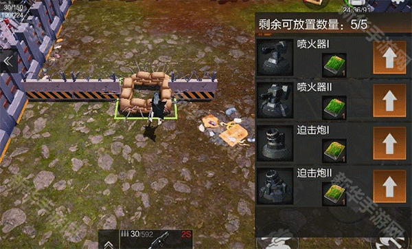 2、前期要想顺利通关防守关卡我们最好安装一个二级机枪塔和一个二级喷火器或者直接两个二级喷火器。