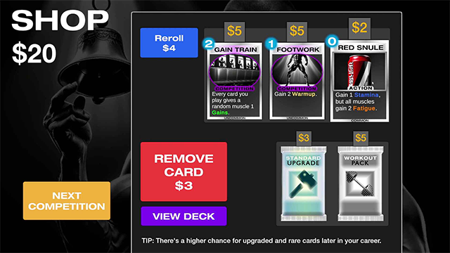 《GET YOKED中文版》在这里玩家可以操控一位健美大师,一个瘦弱的男人,但是,玩家可以用各种训练卡牌来让他变成一个大只的肌肉佬,过分训练会让角色变成畸形,非常幽默有趣,通过夸张的物理形变动画展现健身成果,例如头部可练成尖锥状,变的尖尖的,肌肉增长过程伴随形态扭曲的趣味表现,再加上1本游戏的3d画面也非常的幽默搞笑,喜欢的玩家快来下载体验吧!