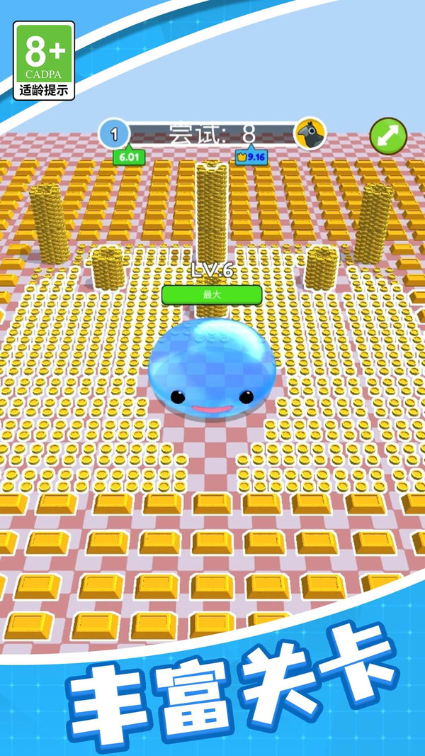 2、极品球球冒险以独特的吞噬成长玩法为核心,玩家操控蓝色史莱姆不断吞噬各种物品,体型和实力会逐渐增强。