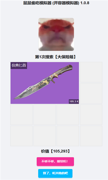 【偷吃模拟器】这是一款模拟开箱类型的游戏,这款游戏是b站up主“Orzice”制作的“三角洲行动”开箱模拟器,玩家可以在这里选择自己喜欢的箱子,比如保险柜、登山包、储物箱和电脑服务器等等,通过开箱获得红色高级物品,成为最强鼠鼠。如果玩家在原版游戏中开不出红装,那么这款游戏绝对能让你爽快开吃,而且没有任何风险,你是能开出人像还是咖啡豆等等,都能让鼠鼠们爽快开吃。