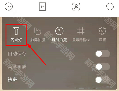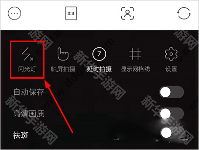 1、在相机左上角的设置功能可以看到”闪光灯“的功能选项,点击开启。