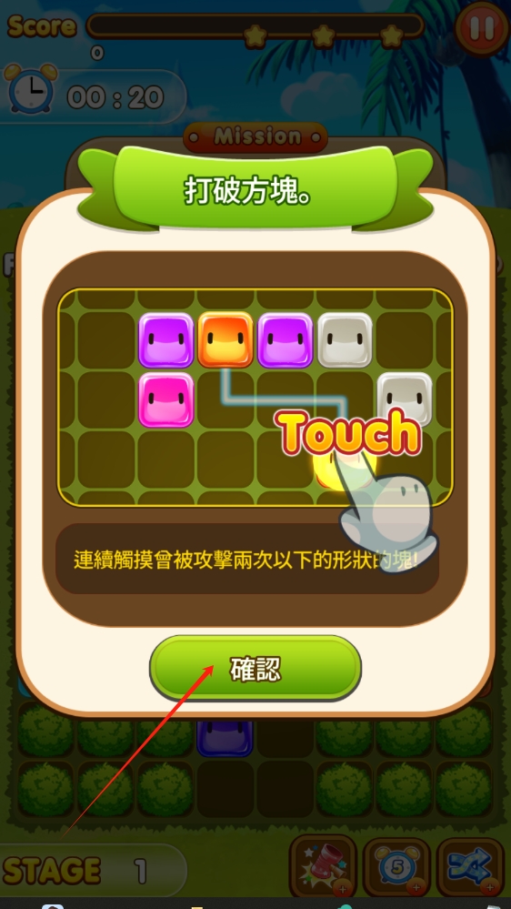 2、游戏中连续触摸可攻击两次以下形状的方块,完成打破方块任务,获取分数。
