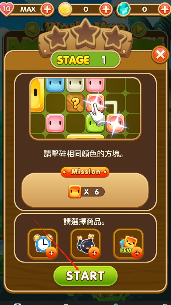 1、在关卡选择界面,点击START按钮进入游戏,按提示击碎相同颜色方块。