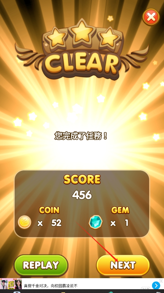3、任务完成后出现CLEAR提示,点击NEXT按钮,进入下一关卡继续游戏。