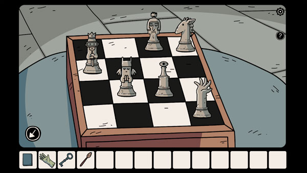 输入密码打开书柜,获得「扳手」和「棋子」。查看留言板上的卡片内容,将棋盘上的棋子摆放到正确位置(如图示)以获得「电池」。