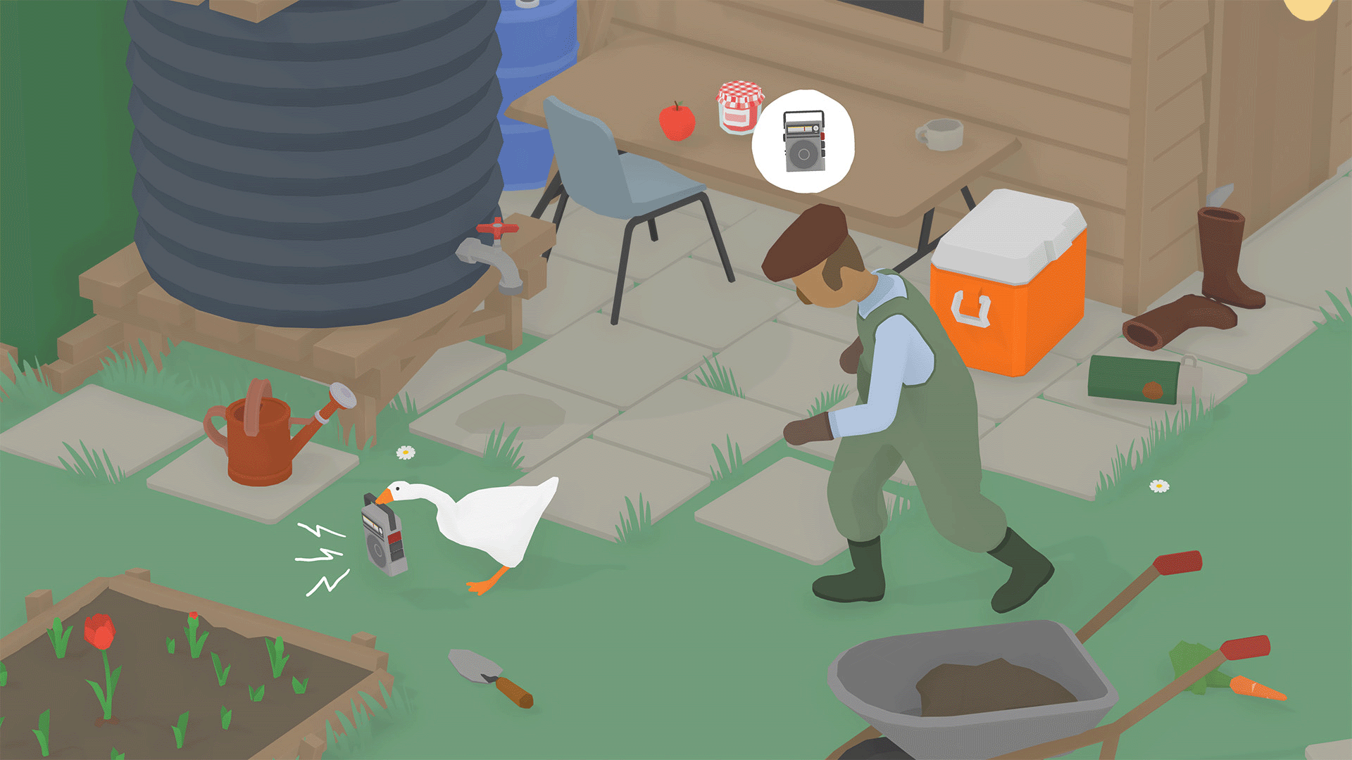 2、触发洒水器恶作剧,提前把人类引到洒水器附近,再用大鹅触碰开启,让水流精准浇到目标,完成搞怪目标。