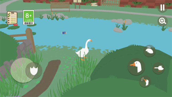 【大鹅向前冲手机版】是一款充满趣味和搞怪的休闲益智类手游,也是由pc端同名游戏移植而来的游戏,在游戏中我们将扮演爱搞恶作剧的大鹅,闯入宁静的农场和小镇街道,在这里开启我们的大鹅冒险,穿梭在各个角落制造混乱,偷偷拿走小孩的眼镜、偷走园丁的钥匙或者用洒水器捉弄人类。游戏中没有具体的任务和紧张的时间限制,我们可以利用场景中的任务道具,灵活走位捉弄NPC,并且逃避人类的追捕。