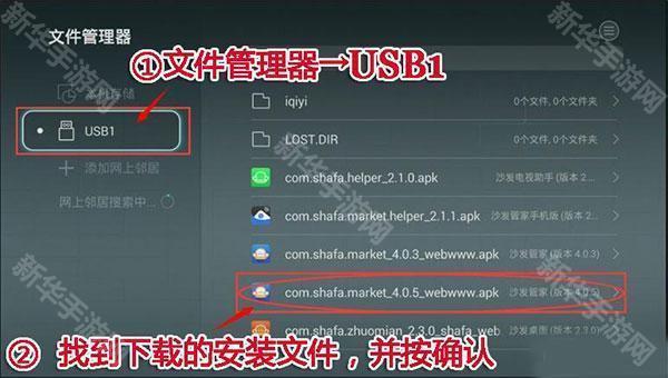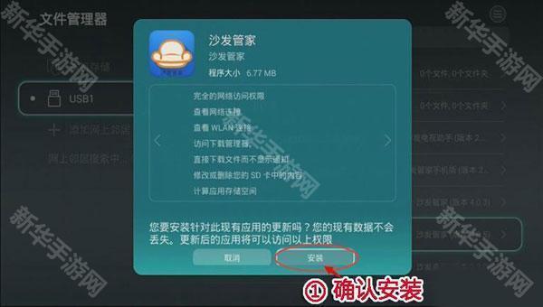 3、 在文件管理器→USB1栏目里找到沙发管家安装文件,按确定 ;