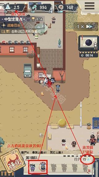 玩家在开始战斗前,可以点击右上角的三条杠图标,再点击观察地图进入观察模式,观察一下区域,先在人少的地方释放僵尸进攻。