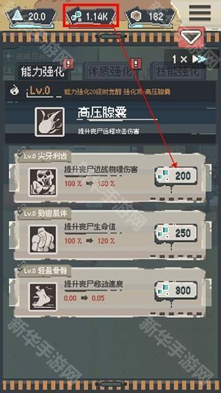 玩家可以点击下方强化图标,使用蓝色能量,强化僵尸,提高它们的伤害、生命值、移动速度。