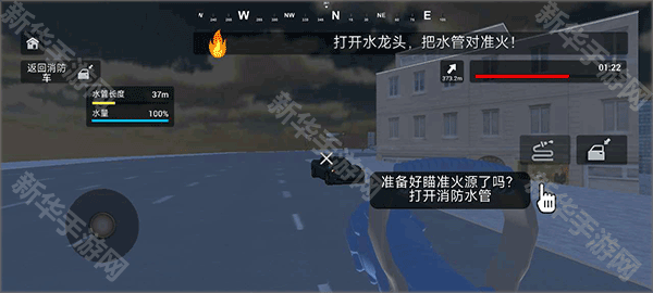4、点击如图所示可以将换消防水管调出,对准火源进行灭火。