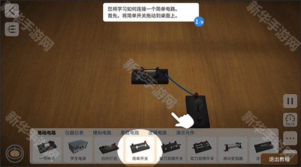 3、点击需要的仪器,将其拖拽到桌面上,并设置好开关和导线等辅助工具后,就可以进行电路模拟实验了。