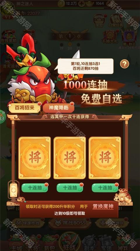 【西西三国0.1折无限送充值】这游戏是一款三国卡牌类型的游戏,游戏将历史英雄与元素相结合,带来了充满创造力和幽默的新体验。玩家可以加入由这些成分转化而来的英雄,征服三国,并通过放置它们完成各种任务。月卡和至尊卡也免费赠送,各种任务也赠送神魔角色和热门的将军。培养将军不花一分钱,玩家只需要通过配队和挂机,就能获得升级道具,喜欢的快来试试看吧。