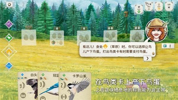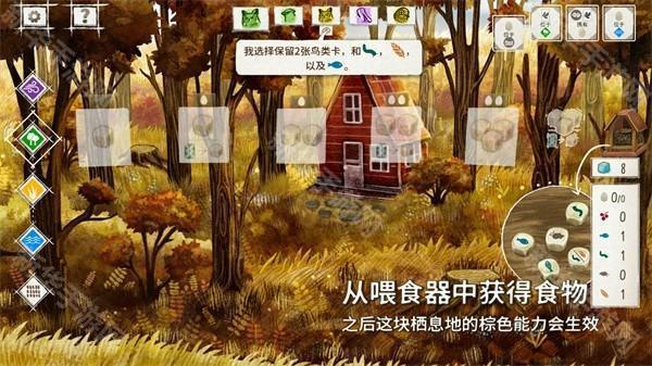 1、游戏为回合制,每个回合主要分为四个阶段:获取食物、鸟类产蛋、抽取鸟类卡牌、打出鸟类卡牌。