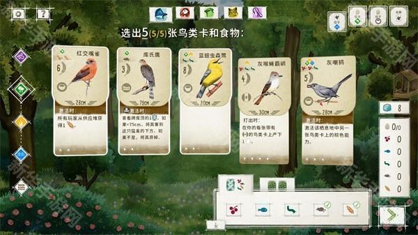 4、食物的获取需要在森林里掷骰子来进行,拿到食物后才能打出以这种食物为生的鸟类卡牌。有些鸟类卡牌的打出不仅需要消耗食物,还需要消耗之前其他鸟类下的蛋,因此各种资源的安排一定要合理,才能确保玩家在自己的每个回合能打出鸟类卡牌,获得的分。
