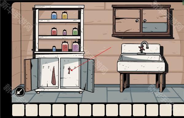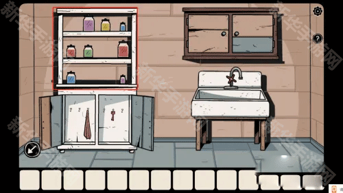 2、打开蓝色的门进入盥洗室,按照片上的提示摆放架子上的罐子,完成后拿走下面的「钥匙」。接着打开水池上方的柜子拿到「对讲机」,然后出去用钥匙打开钟表左侧的门。