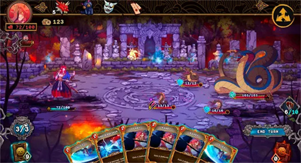 游戏的玩法以卡牌的形式完成战斗,玩家需要通过抽到的卡牌来决定角色的下一步行动,并且组合形成必杀技,消灭敌人,游戏的特效亮眼,风格独特,并且每个角色都有独特的配音。