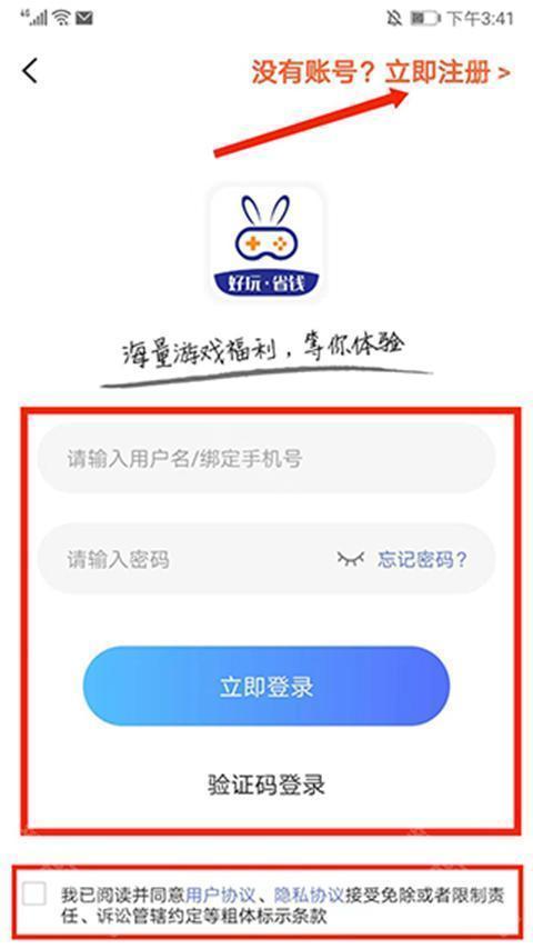 1、打开在本站下载好的巴兔游戏助手,如果有账号可以选择账号或者验证码登录,没有账号可以选择右上角“立即注册”后,勾选左下角条款,进行登录,
