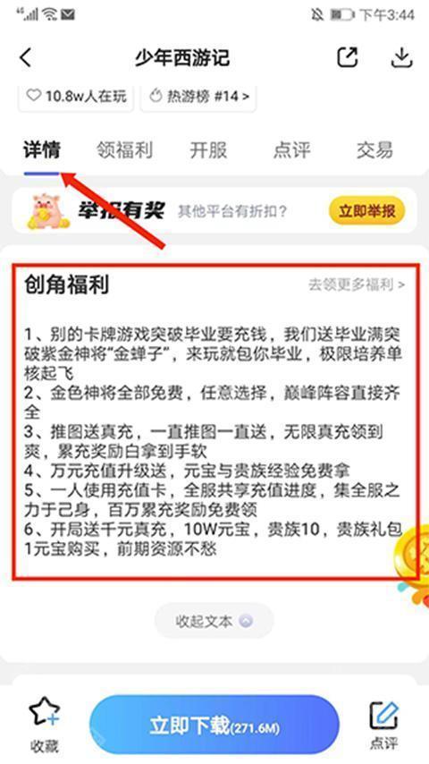 4、进入相应的游戏界面,包括“详情”、“领福利”、“开服”、“点评”、“交易”以及下方的“收藏”、“下载”和“点评”等选项,首先选择“详情”,