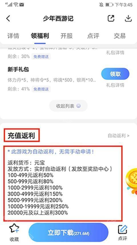 7、往下滑动,进入【充值返利】栏目,可了解详细的返利货币、发放方式以及返利比例,