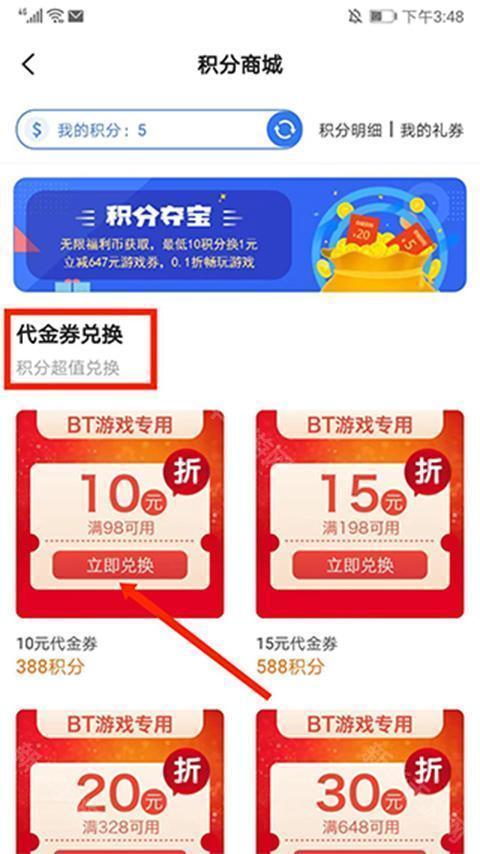 5、进入【积分商城】界面,在代金券兑换界面,选择需要的充值类型,这里以“10元代金券”为例,选择“立即兑换”选项,