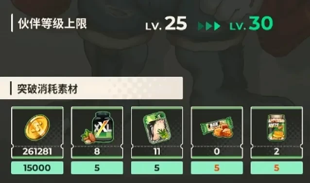 当伙伴等级达到当前上限会要求突破,消耗素材为金币+多种突破材料,突破材料目前只能通过主线关卡获得