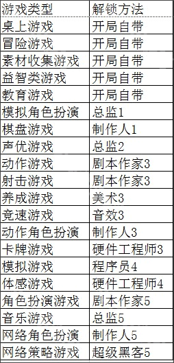 PS:第4年的1月之后,资金达到6000并且至少有1款游戏后可以进行第一次搬迁,更换为6人工作室;在制作游戏获得设计奖、音乐奖各一次,并且资金达到25000以上就可以第二次搬迁,更换为8人工作室。