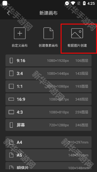 2、新建画布可自定义画布和创建像素画布,还可根据图片创建画布:导入需要临摹的图画,即可自动适配相同像素的画布;