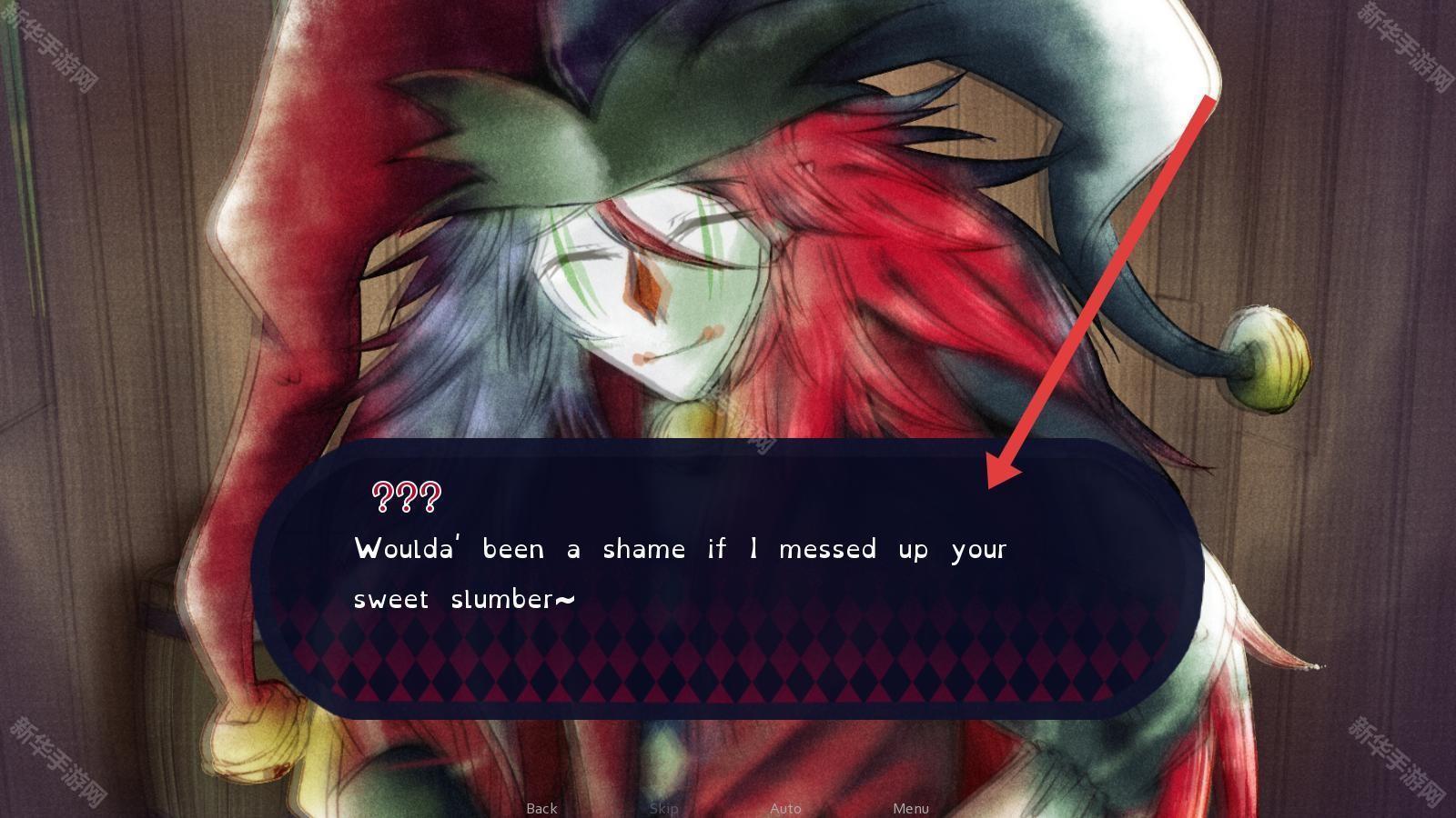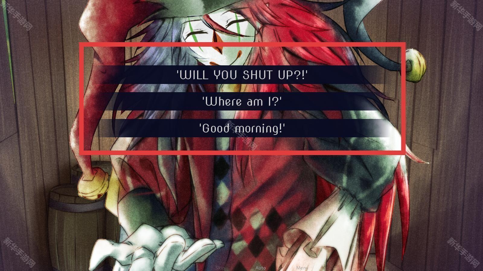 2、遇到小丑对话,耐心阅读文本,了解剧情,按提示推进,注意对话选项对后续发展的影响。