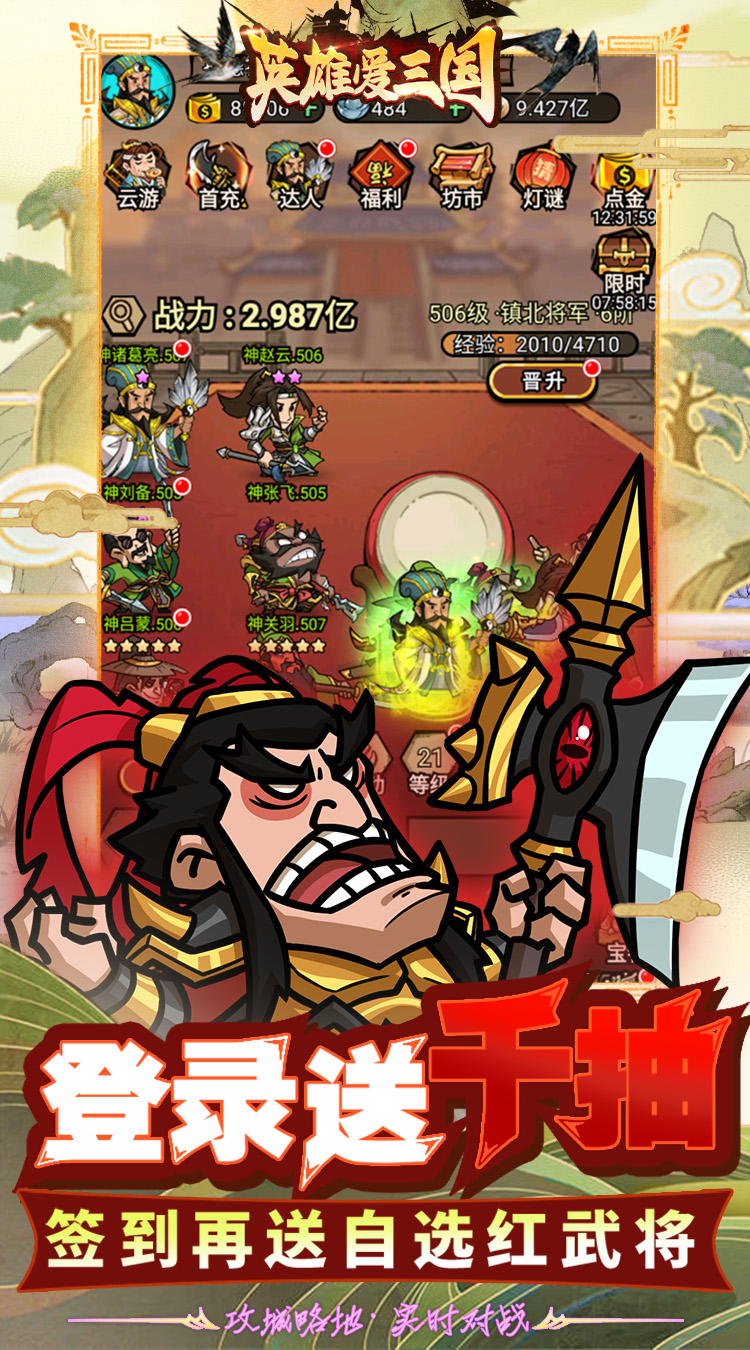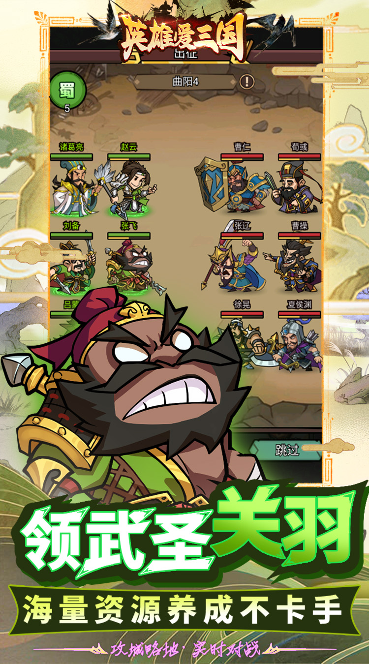 1.采用Q风格和写实绘画风格的结合,人物设计既可爱又英雄,华丽的技巧效果和场景细节还原了三国的历史氛围。