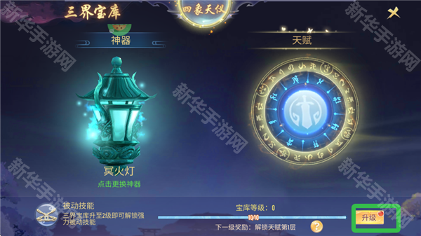 4、点击三界宝库,可为神器升级。