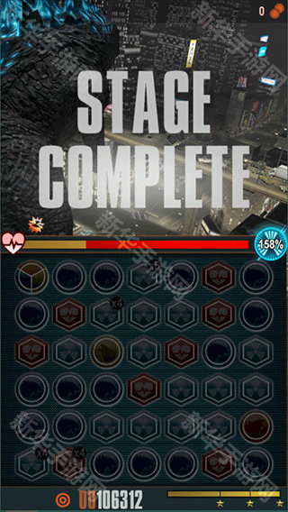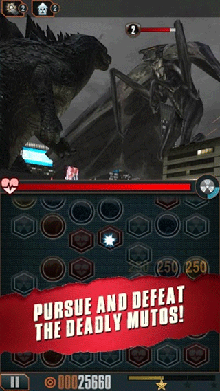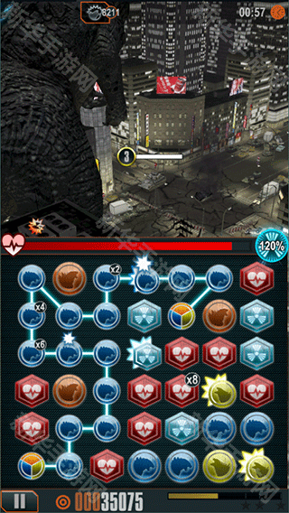 【哥斯拉3】这是一款消除和格斗结合类型的游戏,游戏由“Rogue Play”工作室出品,玩家将扮演哥斯拉,在游戏中通过三消来提升自己的能力,释放技能来破坏城市,不同的图标能给哥斯拉提供不同的能力,心形是增加血量,浅蓝图标是发出激光,而深蓝色图标是用动作进行战斗,同时,玩家还能看见屏幕上的哥斯拉战斗,甚至能看见其他怪兽电影的角色,喜欢这款游戏的快来试试看吧。