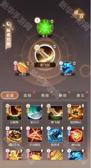 玩家可以同时佩戴四个技能,主要伤害技能——武技,伤害技能——绝技,辅助增益技能——秘技,终极技能——奥义,其中奥义需要玩家手动释放,其他技能会自动选择目标释放。主要伤害技能共有三种,拳武技、剑武技和刀武技,其中拳武技为近战群体伤害,剑武技为远程单体伤害,刀武技为远程群体伤害。