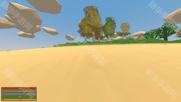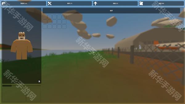 4、进入游戏后如图,游戏采用横版移动操作,键盘wsad键控制上下左右,鼠标控制方向,左下角则显示玩家角色的生命值、饱腹度、饮水量、能量、体力值;