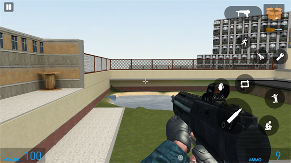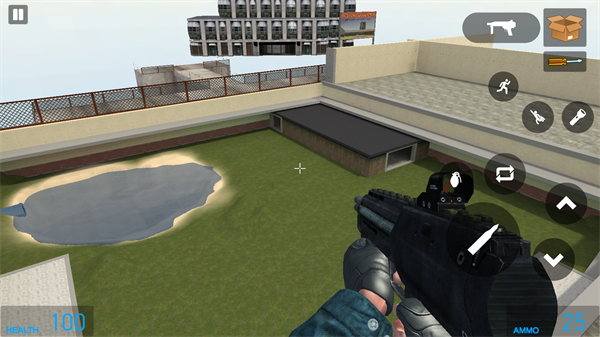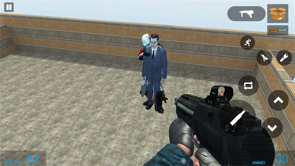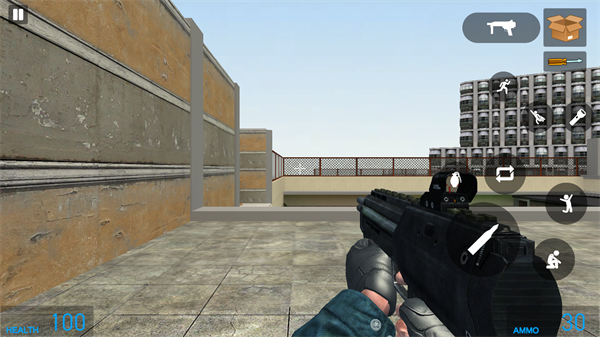 3、游戏左边控制玩家移动,右边控制玩家攻击,跳跃,蹲下,超多的动作,选择屏幕最上方的武器按钮玩家可以自由的选择各种武器,体验丰富的地图;