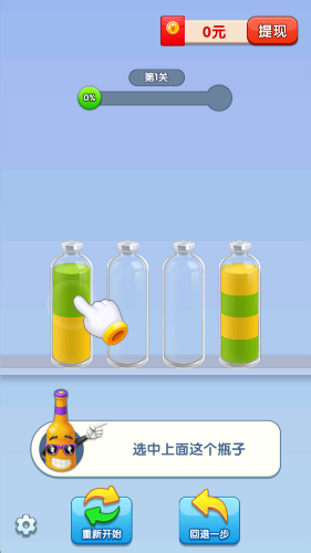 1、游戏中点击瓶子即可拿起,再点击另外的瓶子即可倒水,只能向同颜色液体或者空瓶中倒水。