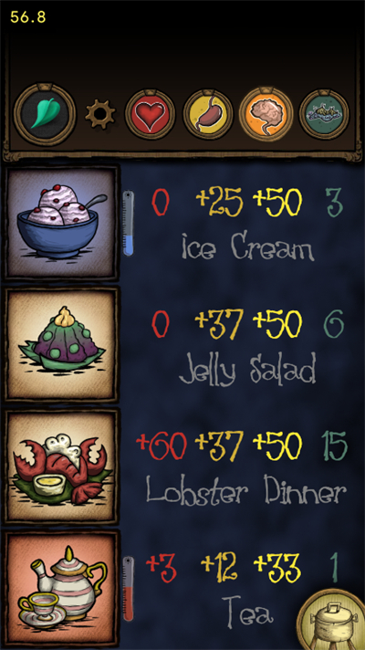 1.按健康、饥饿和原因排序,包括饥荒系列的各种DLC模块以及新的食谱和食物温度。