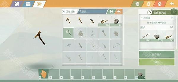 在探索模式中,在出生岛开始游戏后,大家都是一无所有的状态,因此为了能够在岛屿上更好的生存,我们首先需要跟随新手引导做出一把石斧,无论是砍树,还是狩猎都是非常实用的工具。岛主们只需要在地面上拾取【石头】、【木棍】、【燧石】、【草】等最基础的材料,即可制造出赖以生存的第一件工具——石斧。有了石斧,就可以开始快速高效的砍伐树木,获得原木。这样不仅可以制作出一身树皮盔甲,还可以搭建一个休息的营地,及搭建出篝火。
