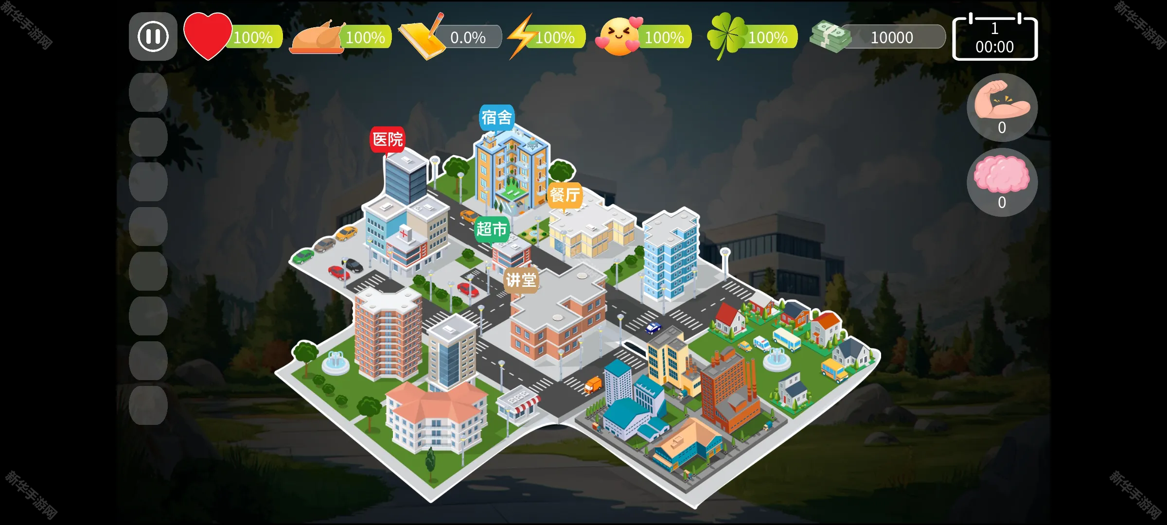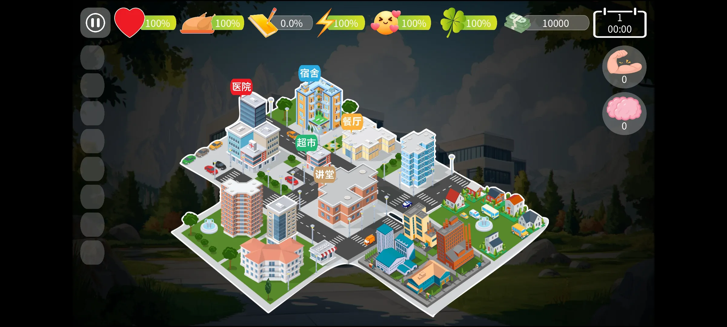 3.游戏场景简洁但功能齐全,包括宿舍、讲堂、超市、餐厅、医院五个地点,玩家需在这些地点间来回安排日程。