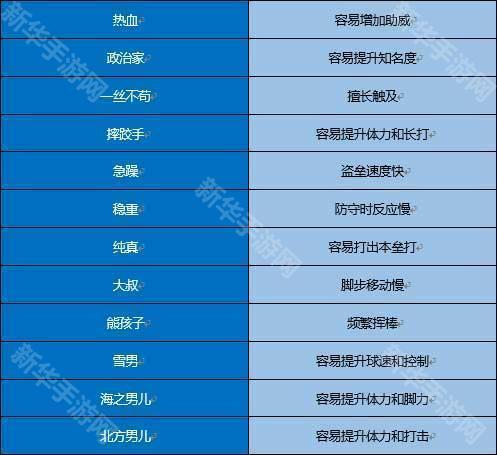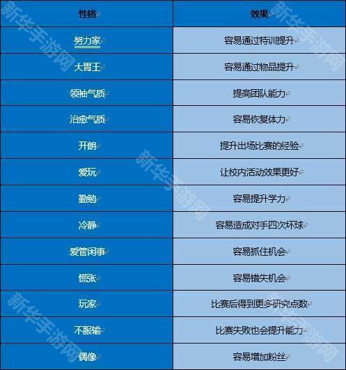 游戏中,每名学生都拥有一种性格,这些性格本身就对运动员有不同的影响,如图: