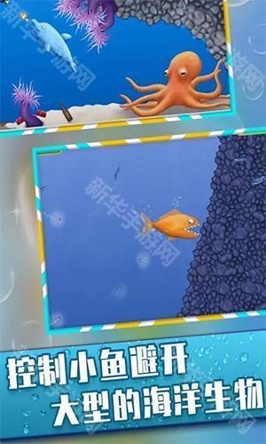 3、玩家通过滑动屏幕控制小鱼的移动,小鱼只能吃比自己小的东西。注意是“东西”,不是“食物”,所以只要是比自身个头小的物体,小到小石块,大到大轮船、战斗机,只要条件允许都能一吞而尽。甚至还能跳上岸去将陆地上的房屋,甚至灯塔装进肚子里,区区人类更是不用说了。不过要注意的是如果比自己体型大的物体有攻击性,就要多加小心了,因为不仅是你家小鱼肚子会饿。例如正在猎食的鲨鱼或大胃王鲸鱼,到了后期因为小鱼变成“水怪”,人类也会派出舰艇或者鱼雷来进行攻击。