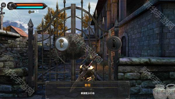 国王村:在普通难度下,属于纯粹新手关,木桶,罐子都是可以砍的,里面有金币,先练练手。敌人来了!会暂时出现一个结界,把你困在这个战场上,直到消灭所有敌人才能离开。开头的小怪就是来送死的,体验一下砍杀和操控吧。游戏支持自动瞄准怪砍杀的辅助系统,总的来说还是比较好用,但有时你想优先杀某怪或面对弓手和法师要尽量快速近身灭之,可能需要调整一下,不要连按,而是朝想杀的怪先冲过去砍