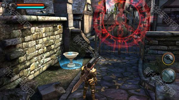 值得注意的是一出来看到的发蓝色光圣水盆,这在单人游戏中非常重要,存盘点+红蓝加满+武器升级三合一功能。游戏的设定并不吝啬,一关中往往有若干个,但如果进入战斗状态就暂时不能使用,所以一定要善加利用