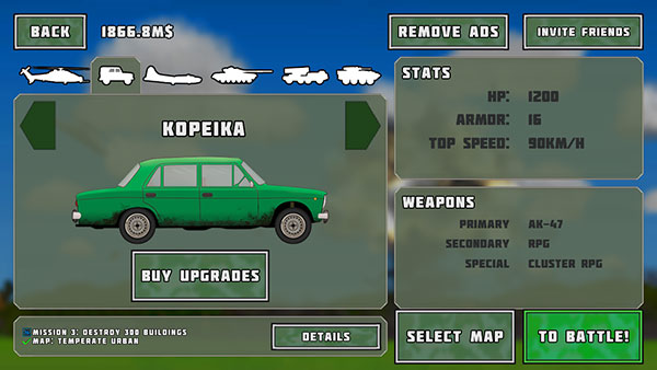 1、游戏中,我们可以在战斗前选择不同的载具,例如直升机、汽车、坦克等等。