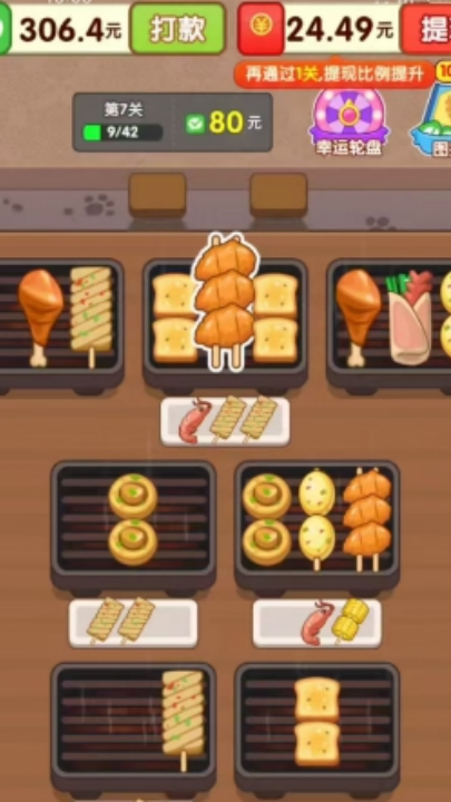 它们杂乱的分布在了不同的烧烤架上,需要通过移动将相同烤串放到同一烤架,集齐三串就能顺利消除。