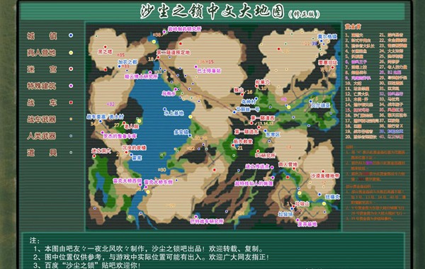 进左边的房间,有一个防御机器当着去路,你必须打败它才能在里间的计算机上打开栅栏门。从这间房子出来,向南21步、向西7步,调查可得到一台SOLOMON2,它可是和红狼战车上的一模一样!继续向西走,不远处就是在茫茫戈壁上由乱石堆砌的所谓“大鸟”,在这里走走,很容易见到第十个通缉犯“沙漠之舟”(赏金150000G),这家伙的装备太酷啦,而且是多重攻击!不过它也有一个致命弱点:铁弹!挨一弹后就“装备损坏,无法攻击”,呵呵。解决掉沙漠之舟后向北走,到河边有一无名小镇,这里的各种武器装备可以说都是终极的了。从小镇在向西来,直到最西边的大山脚下,有一个大山坳,在里边来回走动,你遇到的怪物70%都是“金蚁毯”!用钢弹或铁弹,几乎一弹一个,打倒一个你就能得到5000G!嘿嘿,发大财了你,还愁买不起、改不起好装备吗!