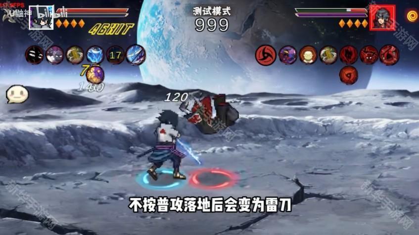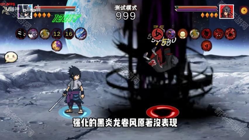 永恒佐助的“须佐能乎·天照”可抓取敌人并附加黑炎灼烧,技能特效与原著动画一致,普攻5a触发豪火球与快速落地斩,还原度达90%。